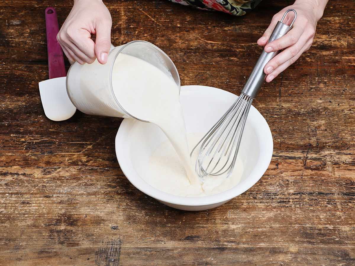 Whisk the three milks until combined, and then pour back into the measuring cup.