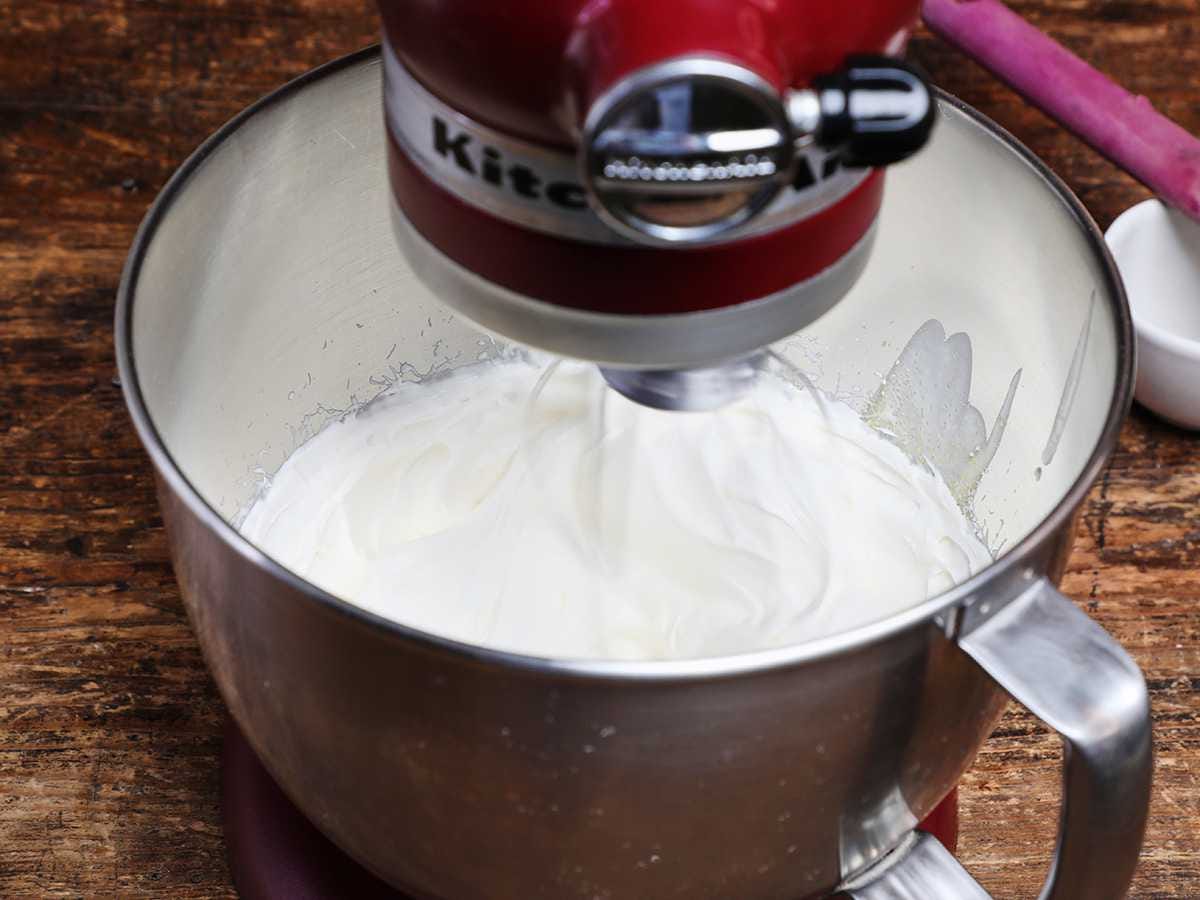 Whip the cream on medium speed until soft peaks form. Take care not to over beat. If you do so, the cream could separate. The cream should be light and fluffy.