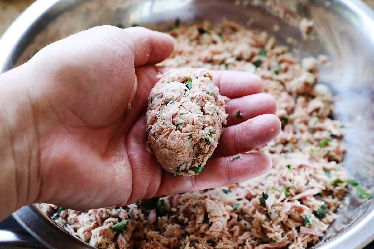 Place an egg-sized scoop of tuna mixture in the palm of your hand and form into a tight patty. Do this with all of the mixture.