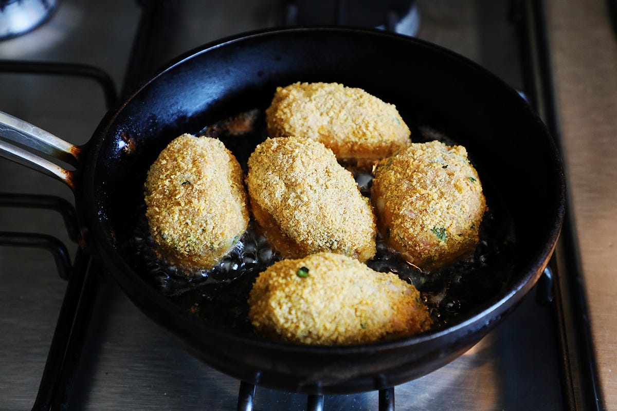 After dipping each patty in the egg coat the patty in breadcrumbs.