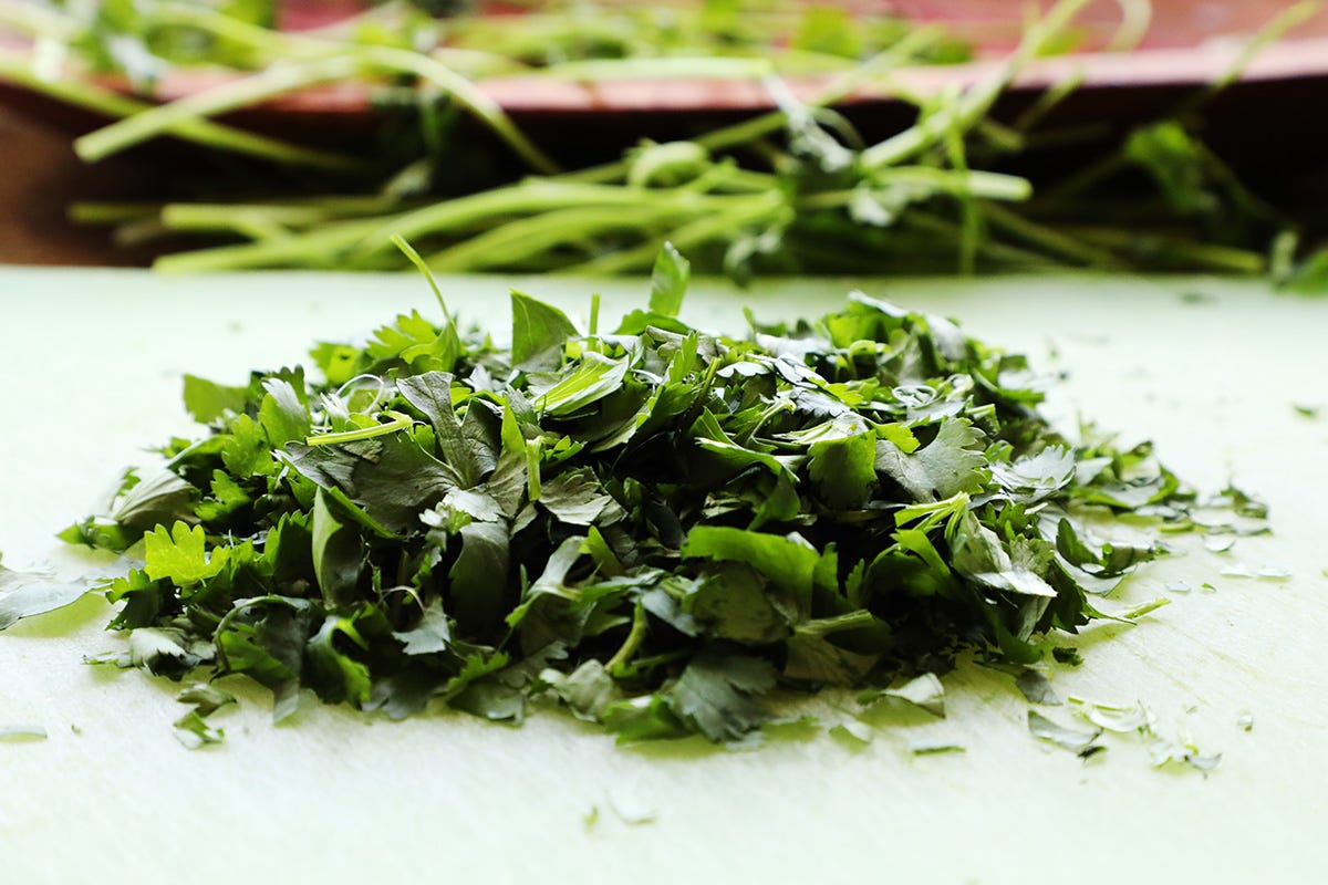 Rinse the cilantro well and pat dry with a paper towel. Remove the stems from the cilantro and discard. Roughly chop the cilantro. You should have about 1 cup of loosely packed cilantro.