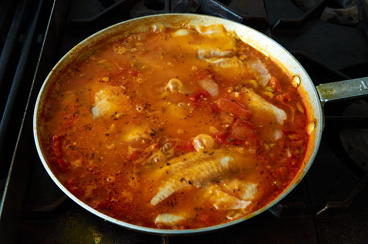 Once you have browned the fish on both sides, place each fish fillet in the simmering sauce.