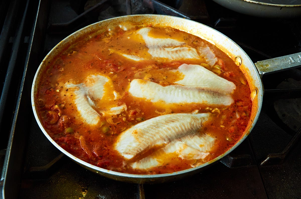 Cook for 10 minutes until the sauce has thickened slightly and the fish is fully cooked and has taken on the flavor of the sauce. Check the flavor of the sauce and adjust the salt if necessary.