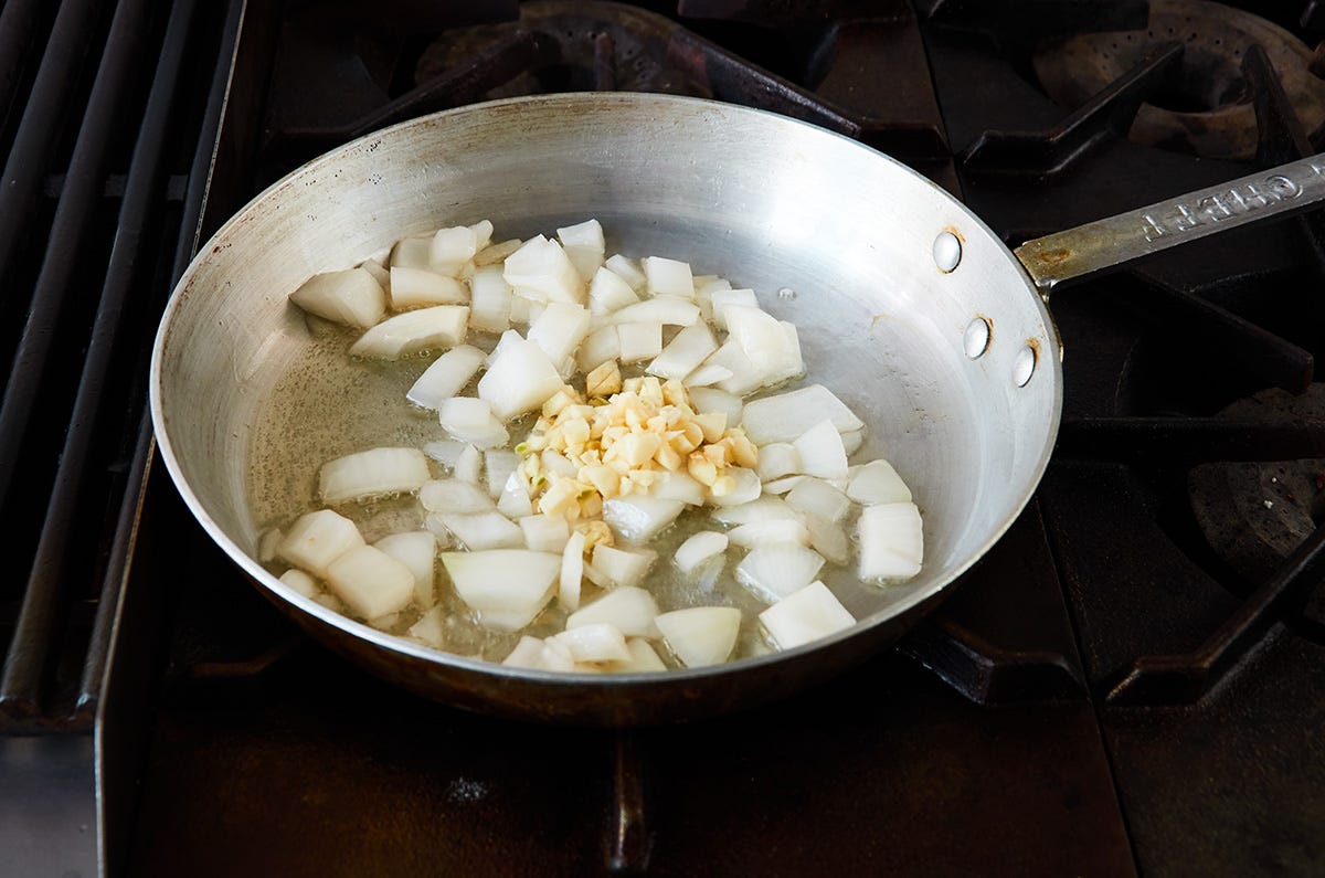 Over medium heat, fry the onion and garlic in 3 tablespoons of cooking oil for 4 minutes. You are starting to build flavor in the sauce.
